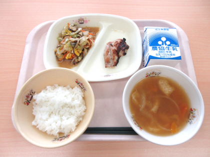 今日の給食は「ごはん、牛乳、生揚げのケチャップあん、ピリッとごまサラダ、こしね汁...