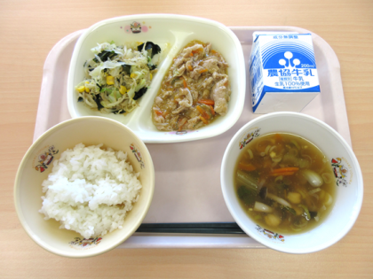 今日の給食は「ごはん、牛乳、元気いっぱい豚肉炒め、じゃこひたし、ひよこ豆スープ」...