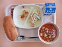 今日の給食は「ソフトめん、牛乳、ビーンズミートソース、ひじきのマリネ、ヨーグル...