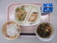 今日の給食は「ごはん、牛乳、白身魚のレモンソース、たくあんのおかか和え、もずく...