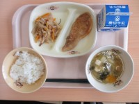 今日の給食は「ごはん、牛乳、鶏肉の西京焼き、じゃこキャベツ、夕顔けんちん汁」で...