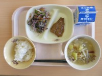 今日の給食は「ごはん、牛乳、さばのしょうゆ煮、ゆかりあえ、さつま汁」でした。今...